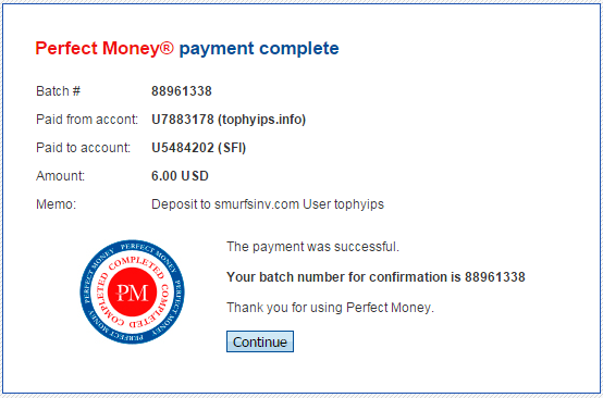 The amount of 1.2 USD has been deposited to your Perfect Money account. Accounts: U5484202->U7883178.