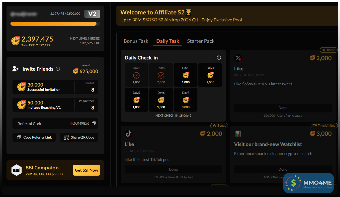 Dự án này mình đánh rất tiềm năng cho anh em hệ cày chay vì cần sự duy trì, các nhiệm vụ khá đơn giản, miễn có cày là có airdrop và MIỄN PHÍ. Và để hỗ trợ anh em người mới làm full task, lấy full điểm EXP, anh em đăng ký theo link ref từ mình, mình sẽ gửi 0.0001 ETH mạng Base (~ 0.4$) làm gas và dùng để mua token SSI để lấy 150k EXP, anh em đăng ký xong thì cmt username bên dưới nhé.