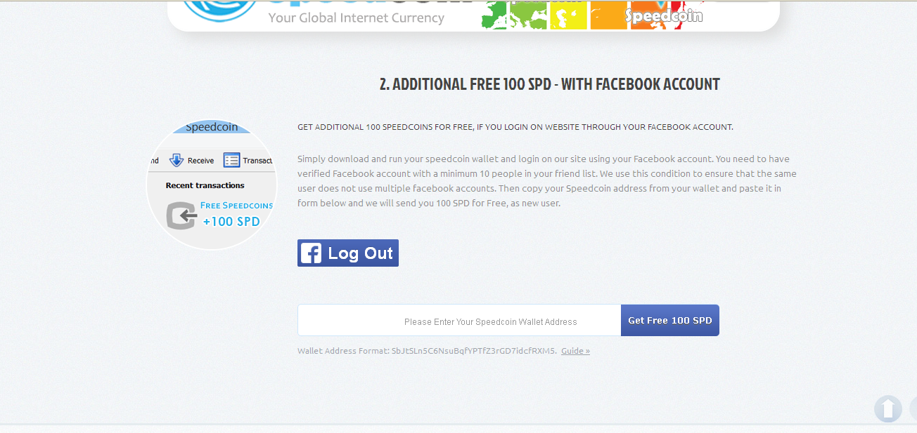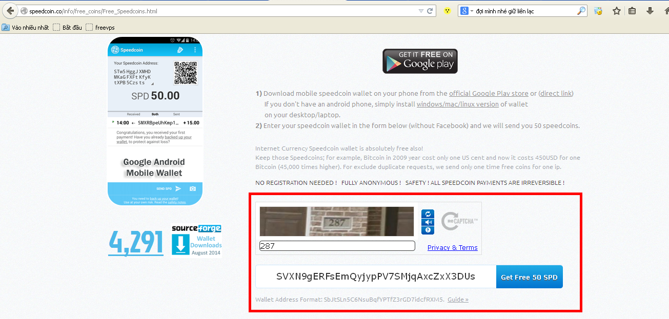 Sau đó qua http://speedcoin.co điền address và bấm get 50 SPD