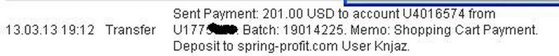 [TD="colspan: 2"]Sent Payment: 501.00 USD to account U4016574 from U1775***. Batch: 19061211. Memo: Shopping Cart Payment. Deposit to spring-profit.com User Knjaz.[/TD]