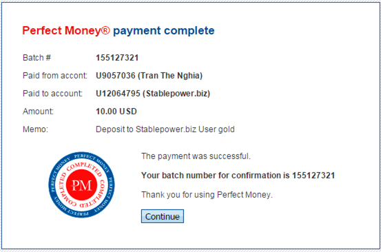 The amount of 1.6 USD has been deposited to your Perfect Money account. Accounts: U12064795->U4603107. Memo: API Payment. Withdraw to hyiptank from Stablepower.biz.. Date: 20:12 05.12.16. Batch: 156210627.