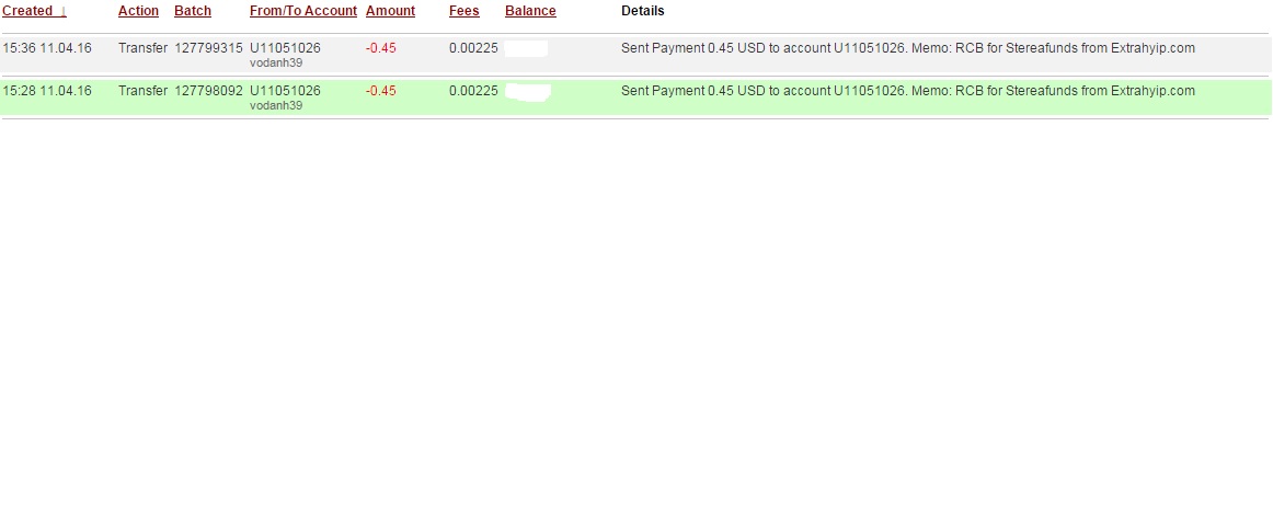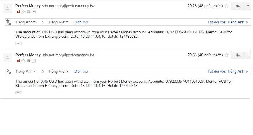 The amount of 4.4 USD has been deposited to your Perfect Money account. Accounts: U10166683->U7920035. Memo: API Payment. Withdraw to ExtraHyip from stereafunds.com.. Date: 14:45 11.04.16. Batch: 127791451.