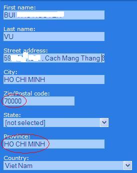 ngoài ra cũng cần lưu ý zip code : điền đúng số của tỉnh mình, và province : tên tỉnh mình