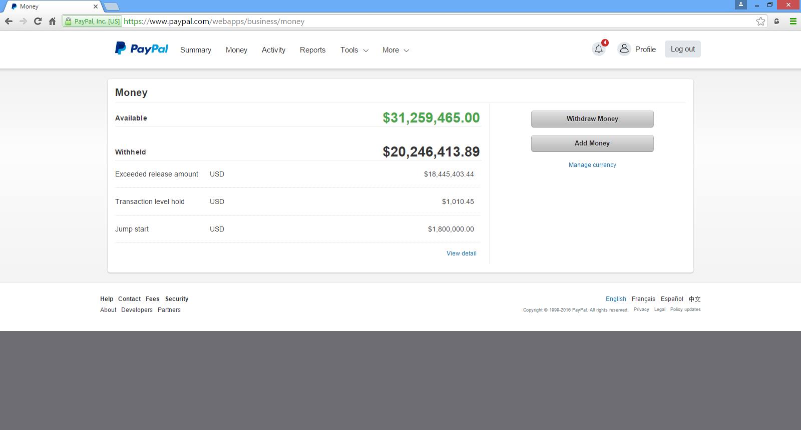 We're in transition to move these funds out of PayPal. I have a meeting today, and if all goes well then we'll have 13 million to cover all member account balances moved into the bank, which will then be sent over to Payza so members can get paid through Payza.