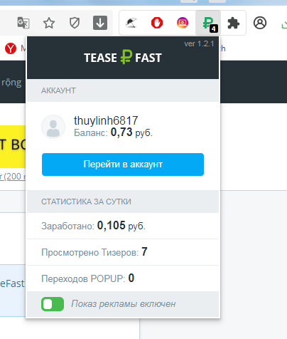 Sau khi cài đặt cái adon nó như thế này, nó sẽ hiện thị số tiền bạn đnag có, có tiền bạ đã kiếm đc trong ngày hôm nay. Rất tiện phải không nào. Nếu thấy tài khaorn cảu mình có hơn 1 rub thì bạn nhanh chóng truy cập vào web và rút tiền về túi đi nha