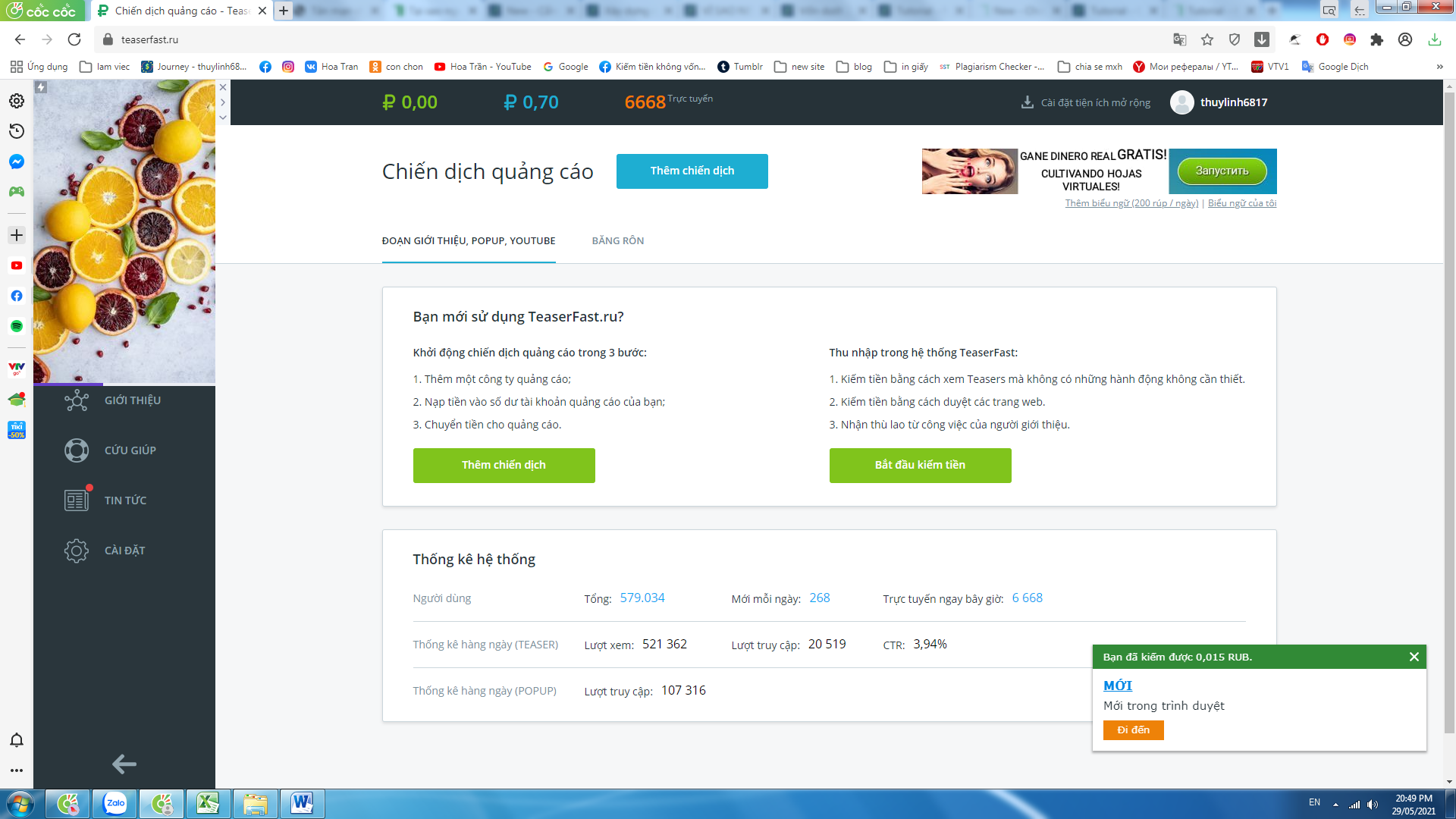 Trang web mình sắp giới thiệu dưới đây vô cùng thú vị. Nó được hỗ trợ tiện ích cài thêm vào trình duyệt web của các bạn. Trong quá trình bạn sử dụng máy tính để tìm tài liệu, xem phim, nghe nhạc... thì nó tự động phân phối quảng cáo đến máy tính của bạn, mỗi quảng cáo được hiện thị nó sẽ tặng bạn 0.01-0.03 rub như 1 món quà. 1 điều tuyệt vời nữa bạn có thể rút tiền ngay về ví chỉ với 1 rub. Không phải làm gì mà vẫn có thêm thu nhập thật là thú vị phải không nào. Vậy bạn đã sẵn sàng đăng ký thành viên để kiếm tiền với site chưa. Dưới đây là link trang web