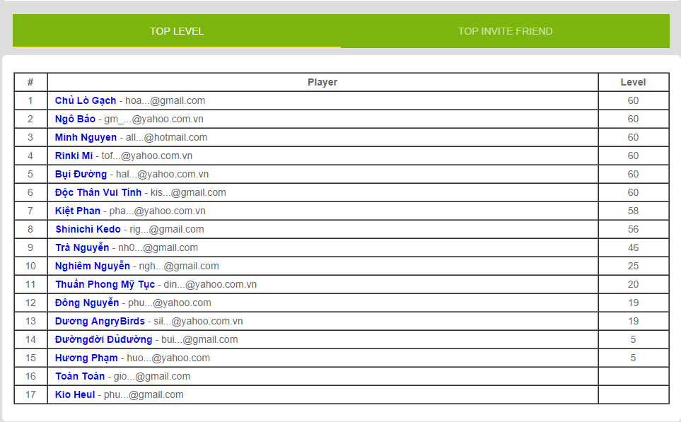 Diễn biến 7:00 ngày 15/12 trên bảng xếp hạng test invite @rinkimi đang đứng đầu với 9 bạn cùng chơi. Thời gian còn đủ dài các bạn hãy giúp mình chơi game và mời nhiều bạn bè cùng chơi để mình có thể lấy được kết quả test tốt hơn. Top level chúng ta đã tìm ra tất cả người thắng cuộc tuy vậy mong các bạn tiếp tục giúp mình test. thanks.
