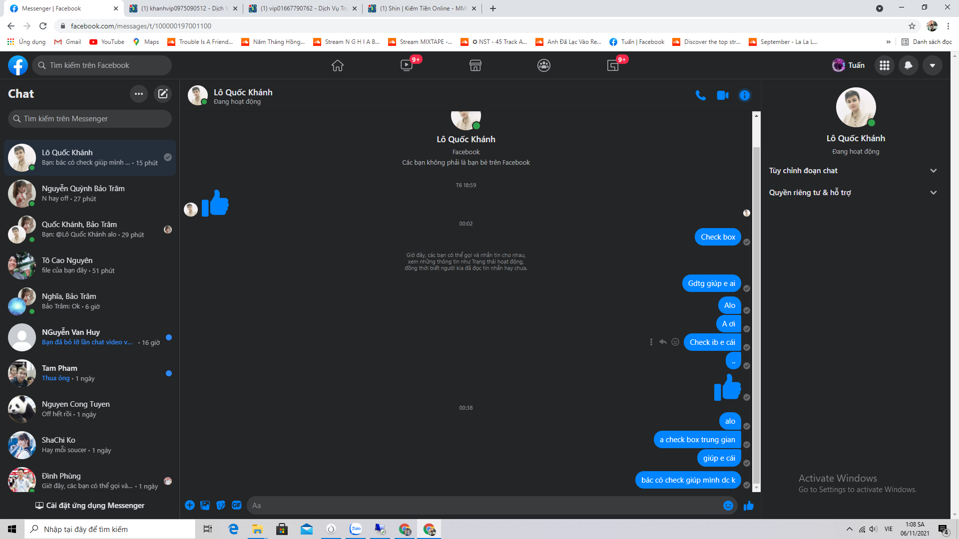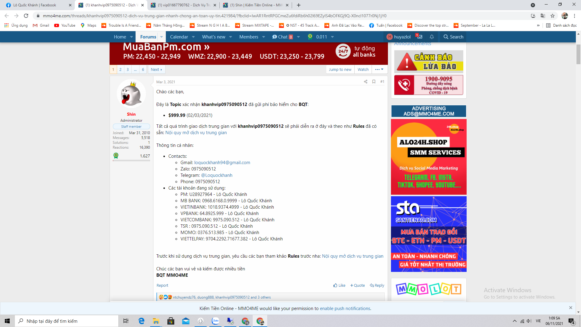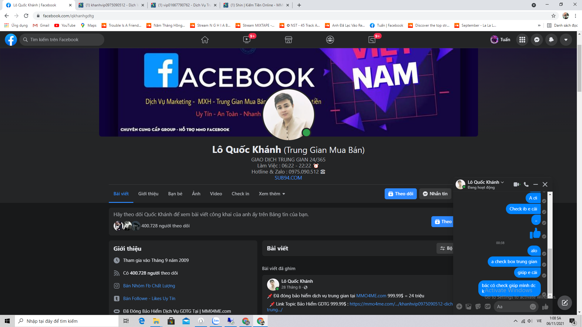 Thái Độ Coi Thường Khách Hàng Của 1 Bạn Có Bảo Hiểm. Chuyện là nay mình có làm việc với 1 bạn khách lạ. bình thường thì mình hay giao dịch trung gian qua bác Trịnh Xuân Nghĩa ( mmo4 của bác nghĩa vip01667790762 ) thì rất là nhanh gọn uy tín thái độ tốt với khách hàng. Nhưng tới ngày hôm nay bạn khách mình không quen Nghĩa và có đề nghị gdtg qua 1 bác khác tên Lô Quốc Khánh. Vì cũng đã đóng cọc mmo nên mình rất tin tưởng chuyện k xảy ra gì cho đến khi done gd mình có pm từ box trung gian cho tới ib riêng kêu ổng check gd * Nhưng bạn Lô Quốc Khánh này vẫn on mà cố tình không rep call sdt ở mmo thì không trả lời . fb thì on vẫn up post vài phút trước nhưng không thèm trả lời ibox. Không biết bạn này khinh thường khách hàng hay cố tình lồi lõm ở đây. Mình muốn nói với các bạn là đừng bao giờ giao dịch qua cái bạn Lô Quốc Khánh ( id mmo4 : khanhvip0975090512 ) này nhé thái độ rất là thiếu tôn trọng khách hàng . Đến giờ phút này mình viết bài này thì bạn đấy vẫn không rep hình ảnh mình để dưới : muốn nói với mọi người né xa cái thg trung gian này ra