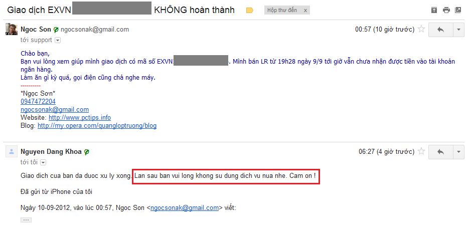 Lúc gần 1h sáng thì email cho support, sáng nay ngủ dậy, thấy giao dịch đã được xử lý, check email thì thấy reply rất là kinh khủng từ bộ phận support của tụi nó. Nó cấm luôn account LR của mình, không cho giao dịch trên site exchanger.vn nữa :binhsua49:Acc LR của mình là U5464501, các bạn có thể nhập thử vào site của tụi nó là biết :binhsua85: