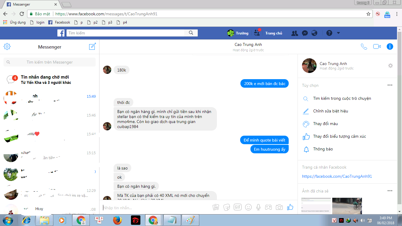 Theo topic NÀY thì @DucChungvn hỏi mua của mình 20 xlm giá thỏa thuận là 200k, liên lạc qua fb ( chat post ở dưới ), sau khi chuyển xlm thì bác ấy bảo chờ check xong mất tích từ lúc đó ( offline message của fb), tầm 20ph sau lại ol mình pm vẫn không thấy rep nên không thể trùng hợp trường hợp bị mất điện hay gặp sự cố gì khác được