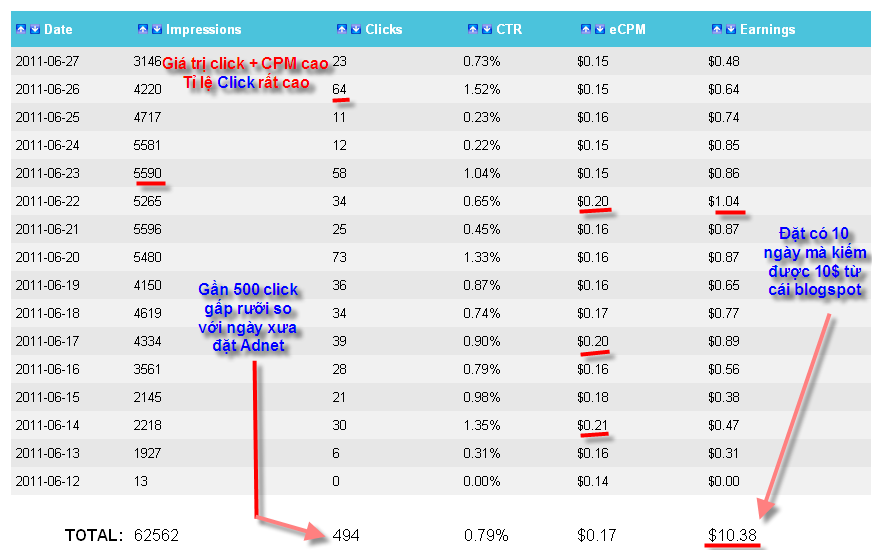 Thành quả sau mấy ngày đặt quảng cáo ymads.com trên blogspot, sau 10 ngày đặt mình đã có đôi chút kết quả chia sẻ với các bạn. Điều đáng nói là mình đặt quảng cáo này trên cái blog miễn phí trên blogspot của mình, blog mình mỗi ngày khoảng 500 uv, sau khi đặt adf.ly cho website thì lên được khoảng hơn 1000 visit / ngày, mình tận dụng đặt cùng với ymads.com khá hiệu quả các bạn xem ở hình dưới đây.