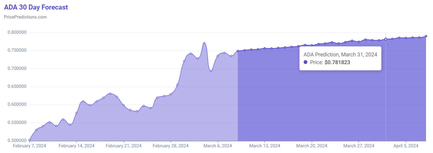 Bất chấp xu hướng tăng chậm lại, thuật toán dự đoán dựa trên AI của PricePredictions, một nền tảng chuyên dự đoán giá trong tương lai của nhiều loại tài sản khác nhau, dự báo rằng Cardano có thể sẽ tiếp tục tăng trong suốt tháng 3.Sự gia tăng được dự đoán sẽ diễn ra theo một quỹ đạo chậm nhưng ổn định, trái ngược hoàn toàn với thói quen tăng nhanh gần đây của ADA và có thể thấy token sẽ tăng 6,22% trong suốt 3 tuần và ở mức 0,781823 USD vào ngày 31 tháng 3.