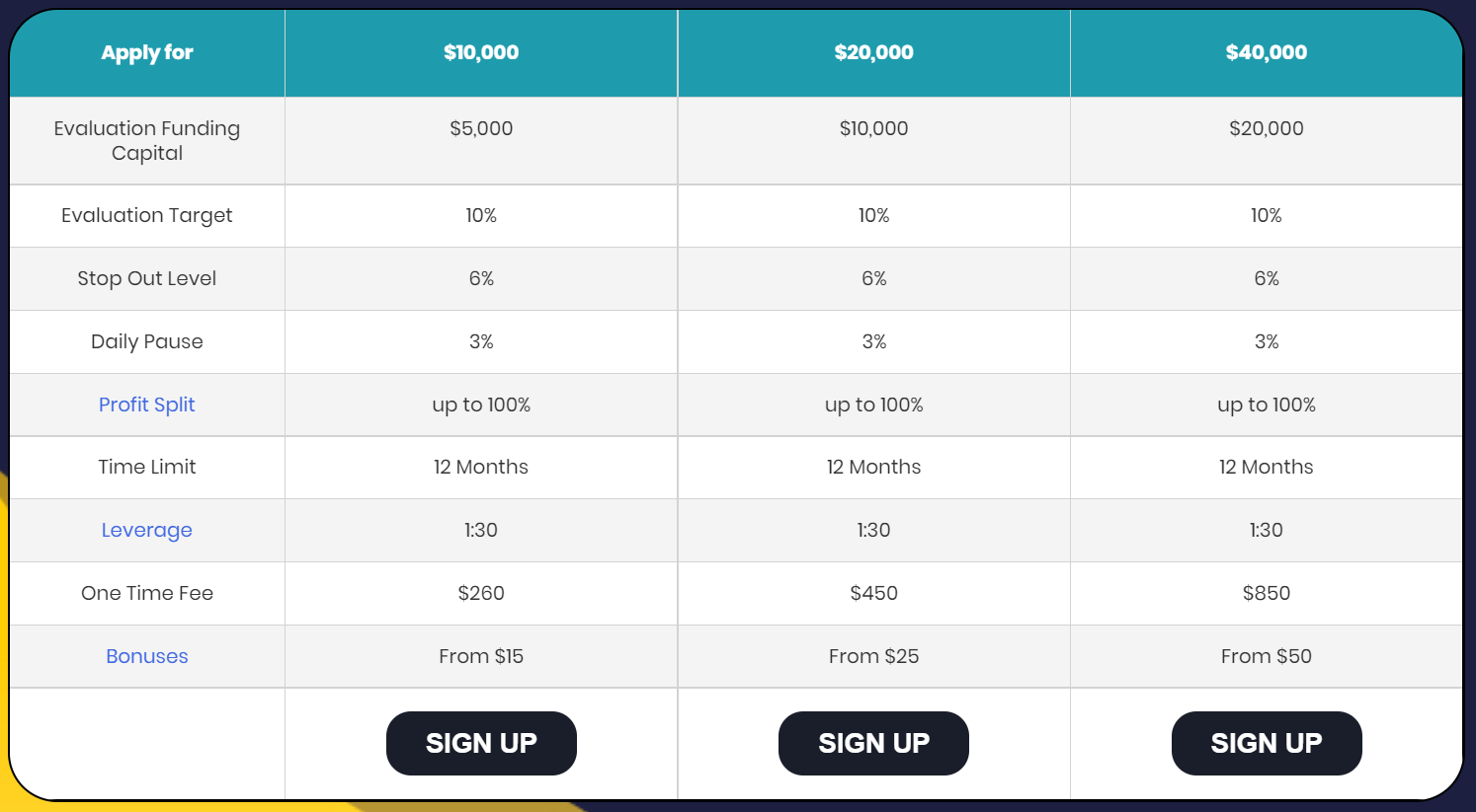 - Chi phí rẻ nhất $95/$225 và được cấp vốn nhiều nhất $100k/250k, khi vượt qua mới phải thanh toán phí $205/$350
