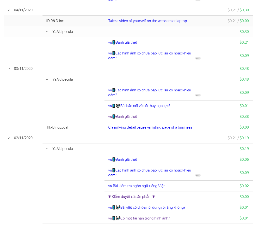 Giờ e toàn ra task đánh giá thẻ với cái hình ảnh bạo lực, sự cố, khiêu dâm. Còn cái task kiểm duyệt thì không thấy đâucái điểm này thấy chả tác dụng j :v ngày đầu 83đ với giờ 500đ e thấy vẫn thế, đều đều ngày tầm 5$, cày cả ngày 7$