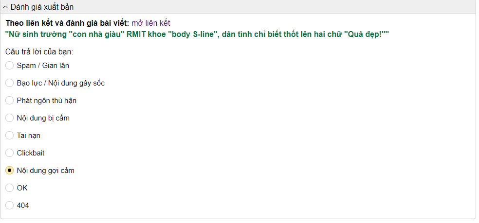 Ấn lên nút Chỉ Dẫn góc trên bên phải màn hình, sẽ có giải thích chi tiết cho bạn, Clickbait là mấy cái dạng giật title câu view dùng tên người nổi tiếng ... còn OK thì là bài viết bình thường ko có vấn đề gì