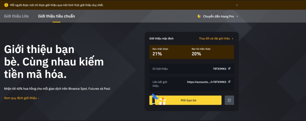 Đây là link giới thiệu của mình: https://accounts.binance.com/vi/register?ref=T0TXIMK3 , khi đăng ký dưới link anh em sẽ được hoàn 20% fee giao dịch và nhận 300$ voucher cashback ( hoàn fee giao dịch )