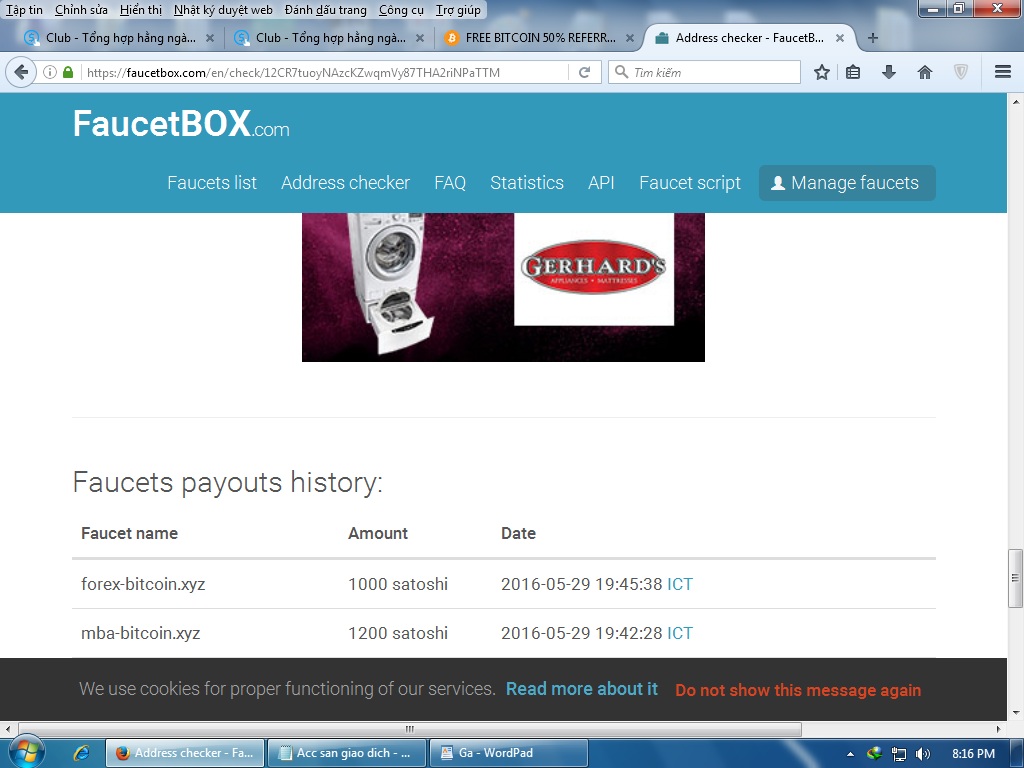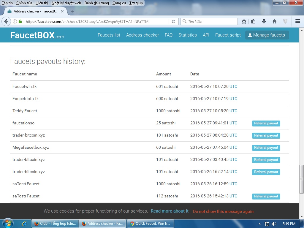 Kết hợp 3 site cũng đc khoảng 4k (tính ref nữa thì đc tầm 5k satoshi), thêm mấy site của faucetbox chẳng hạn như trader-bitcoin, bitcoin-satoshi, forexsan mỗi site tầm 1k..v..v và 1 đống site khác nữa. Có vẻ như đợt này site ngon hơn trước, tính ra cũng tầm 10k/1 lần, ko bèo như mấy lần trc![]()