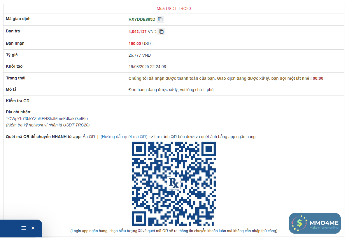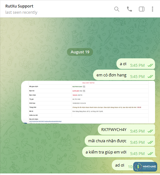 Mình có 1 giao dịch 150 USDT ngày 18/8 ạ. Dưới là tất cả bằng chứng ạ