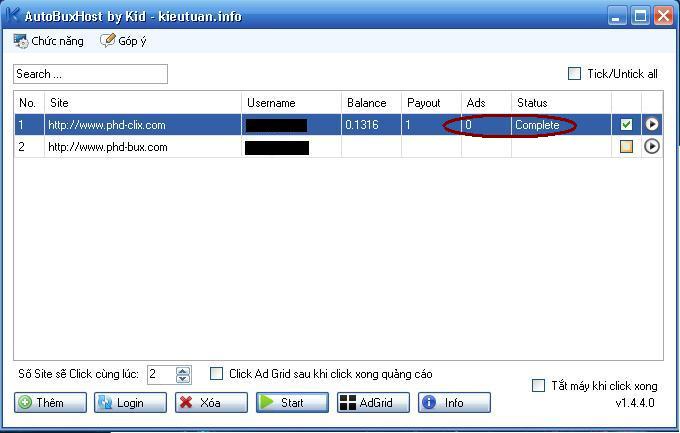 Add site sau đó nhấn start... Nó load 1 hix rồi Complete luôn... Chẳng click Ads nào hết...