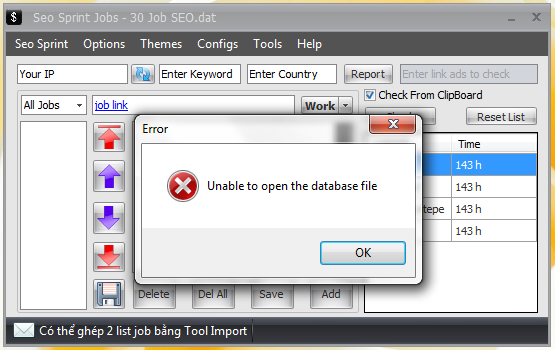 Thường là lỗi ko mở được list job trong lần chạy đầu tiên (Vì tool ko biết list job nào của bạn). Bạn cần vào menu Configs -> Choose List. Nếu lỗi khác thì bạn pm mình suport nhé.