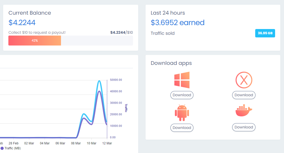 Expected income from one device is about $2 to $15 per month, depending on location (country, city, network type). Connect more devices using different ISP and invite more refferals to increase your income!
