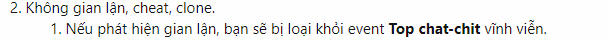 • Nếu phát hiện gian lận, bạn sẽ bị loại khỏi event Top chat-chit vĩnh viễn.