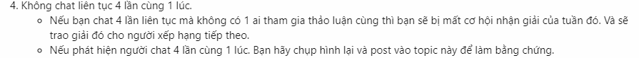 • Nếu bạn chat 4 lần liên tục mà không có 1 ai tham gia thảo luận cùng thì bạn sẽ bị mất cơ hội nhận giải của tuần đó. Và sẽ trao giải đó cho người xếp hạng tiếp theo.