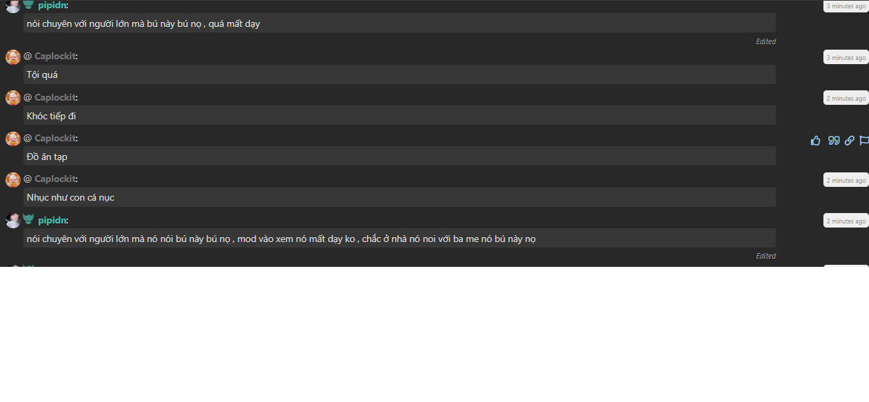 Tình hình là ngài bí bí đái @pipidn đang rất cay cú vì không thể xả rác tự do trong phòng chat như trước, trong khi mọi người đang bàn tán việc kiếm tiền rất sôi nổi thì ngài bí bí đái @pipidn bay vào chửi bới um xùm, làm cho những người newbie ngây thơ như em hết sức sợ hãi