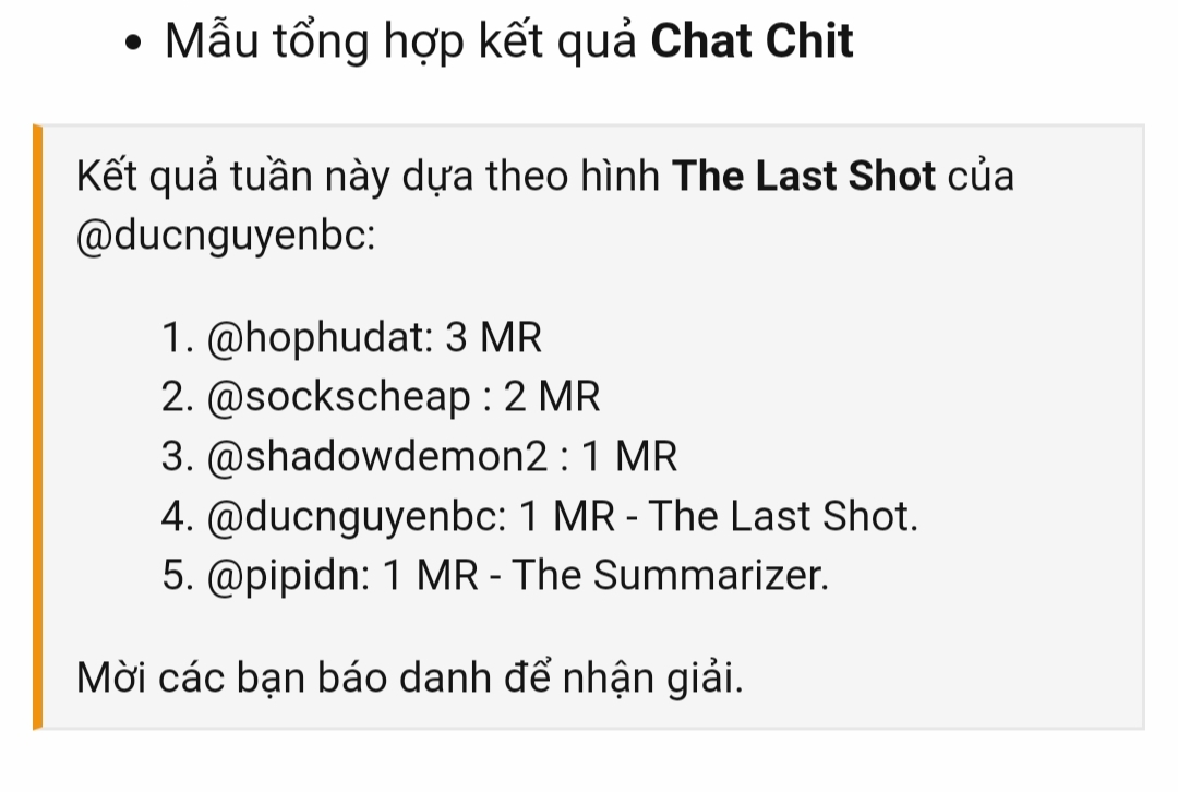 • Phải tổng hợp chính xác, kiểm tra trùng lập giải tuần trước. Mình sẽ chọn bài tổng hợp chính xác và sớm nhất để trao giải.