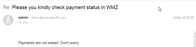 Tui cũng gửi hơn nữa ngày rồi mà ko thấy trả lời trả vốn gì hết. Có thể là nó hết ZTôi vừa gửi mail cho admin Pix nhờ check lại tình trạng thanh toán bằng wmz từ ngày 13.01.2018~hôm nay rồi, có tin gì tôi sẽ báo cho-dù tốt hay xấu.