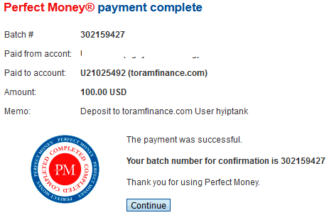 Withdraw to hyiptank from toramfinance.com.. Date: 04:23 10.02.20. Batch: 302207495.