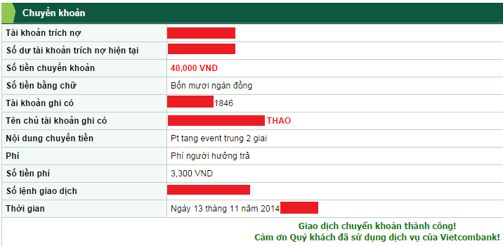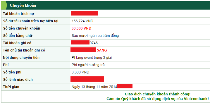 p/s: nhưng mà thớt bảo là chuyển VCB thớt chịu fee mà.. sao m chỉ nhận đc 57k :p