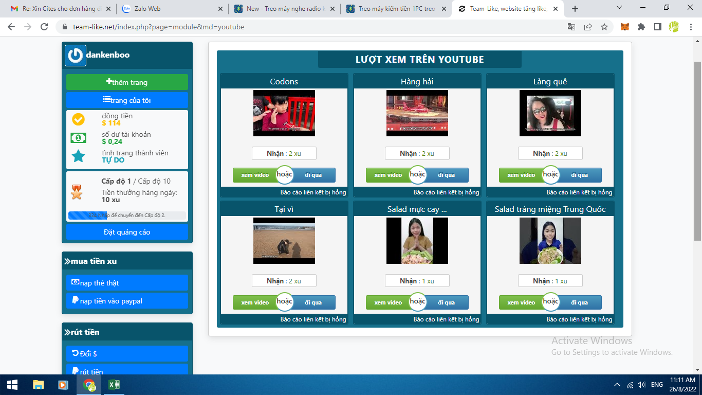 chạy 30-40p là dc 100 video rồi bạn, mỗi video có 20s thôimỗi video đc có 2đ hahaa. mọt kiếp mới đc 1000 đ à bác