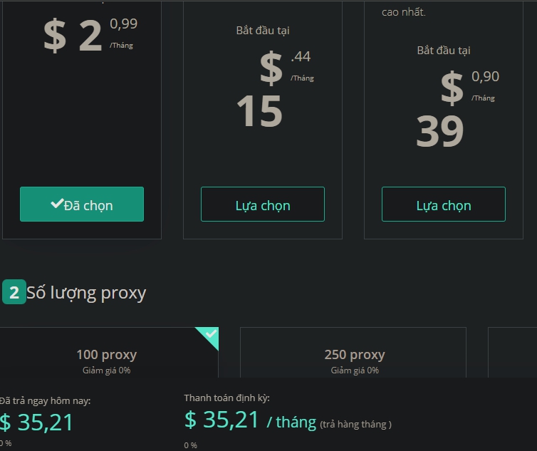 Bác cho hỏi, e chọn gọi 3$ rồi chọn 100 proxy mà sao lại thanh toán thành 35$ bác nhỉ