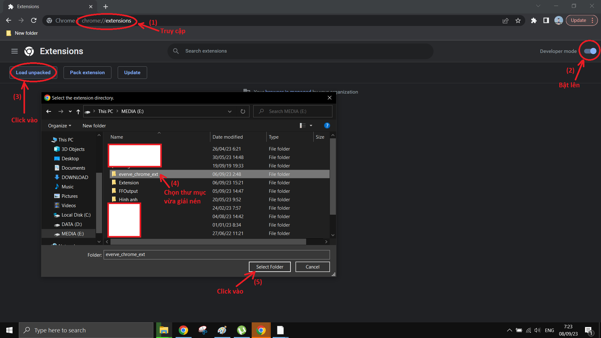 - Truy cập chrome://extensions/ và làm theo các bước như hình dưới để thêm thư mục extension vào chrome: