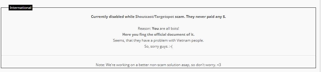 Bác hiểu đại ý thế này, đây là kênh radio chủ yếu quảng cáo các sự kiện mới, ví dụ ca sỹ nó muốn nổi tiếng và nhiều người nghe thấy tiếng hát của nó thì nó thuê đài PR cho nó và trả tiền cho nó, hoạc hãng sản phẩm nào đó ví dụ thằng ô tô, điện thoại nó lên quảng cáo thì trả tiền cho nhà đài, : bên nước ngoài nó đi oto nhiều lên phần lớn nó nghe radio trên oto và các nhà quảng cáo họ thích quảng cáo radio hơn là quảng cáo trên tivi, hay youtube đó, ví dụ nó thuê nhà đài 10,000$ để quảng cáo 1 SP trong 1 tháng, thì nó trích ra 1000$ để trả cho ae nghe đài còn 9000$ nó đút túi, lên các bác khỏi no nó lấy tiền đâu ra trả mình nhé, vài ba $ với ae mình thì kiếm thêm dc thu nhập chứ với bọn tây thì nó có đáng gì đâu, mình thấy vài nghìn VND lẻ trên đường có khi ko muỗn đỗ nhặt thì bọn tây nó thấy vài $ cũng thế; mình chỉ lách luật của nó để kiếm thu nhập thụ động cho bản thân mình thôi, Em chủ yếu chơi mấy web trả ít tiền và bền vững nhiều năm chứ em ít ăn sổi mấy web nào là đăng ký dc vài chục, vài trăm $, nào là chơi 1 lúc có cả nghìn đô, ko có chuyện đó đâu các bác, đơn giản mỗi tháng kiếm 5-7tr tăng thu nhập coi như tăng ca làm thêm giờ là ngon rồi, rất phù hợp với ae sinh viên có máy tính để ko, ae làm văn phòng , cắm đó coi như làm tăng ca nhé