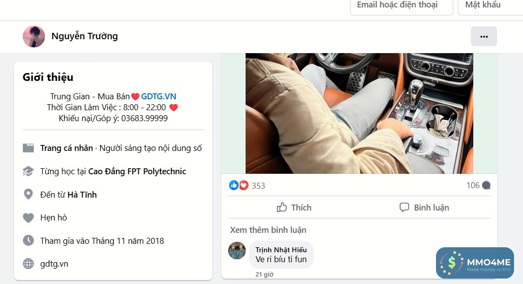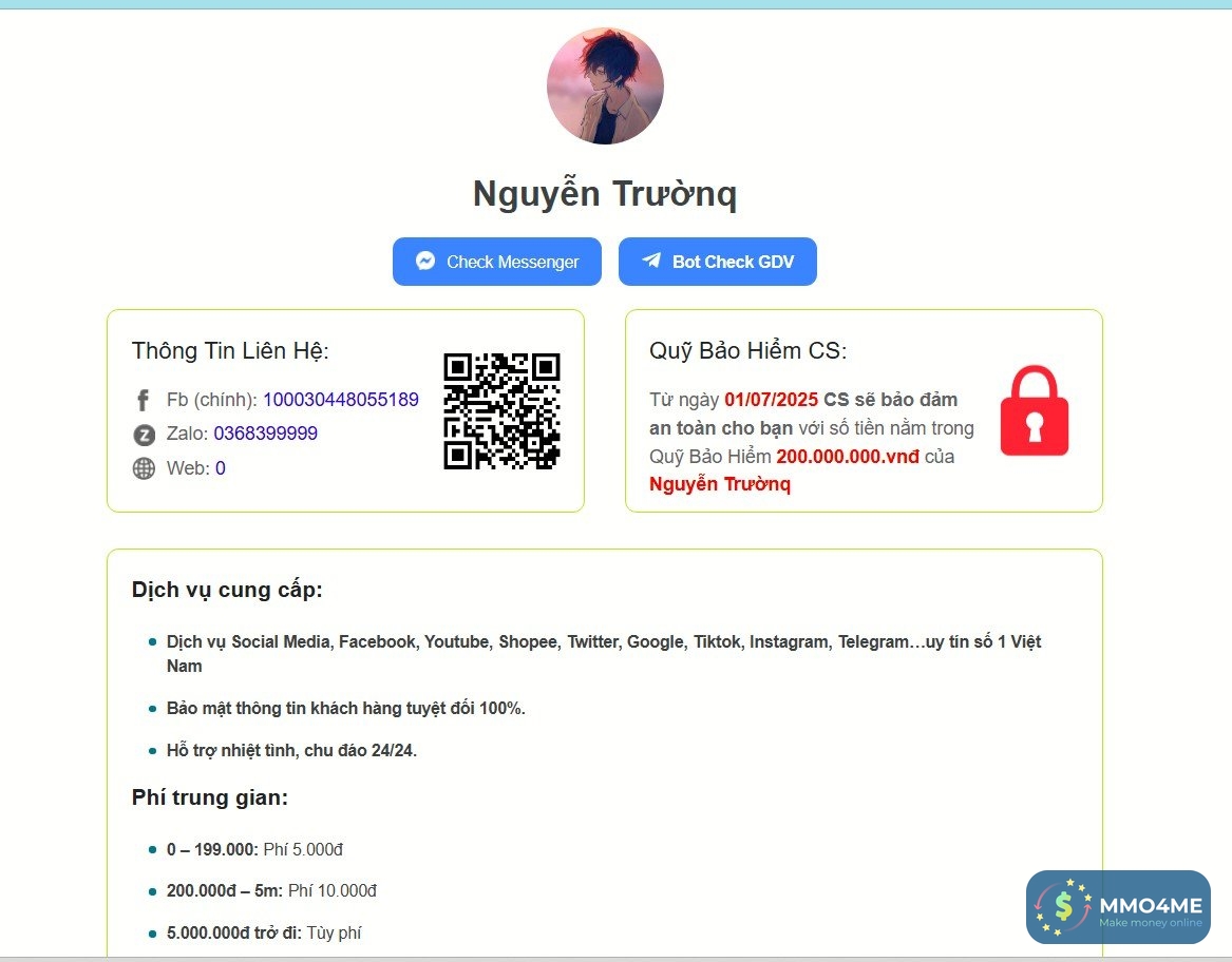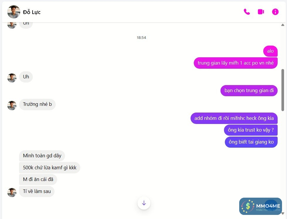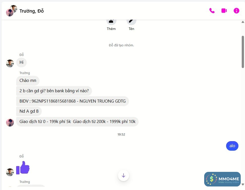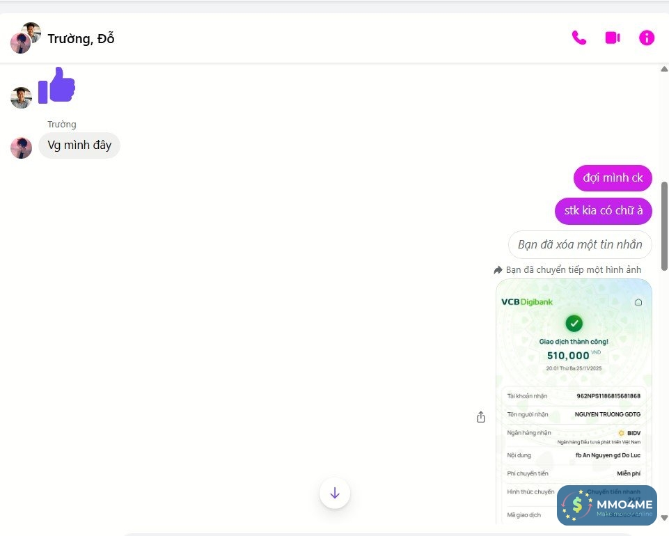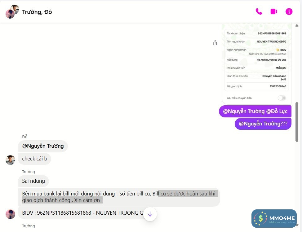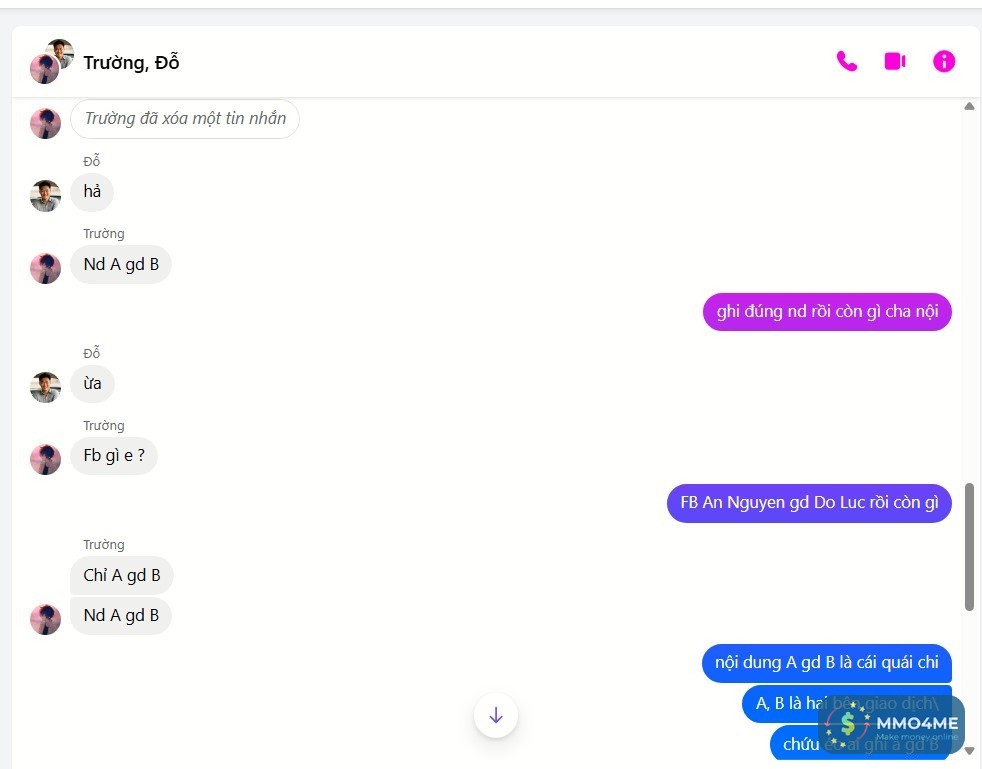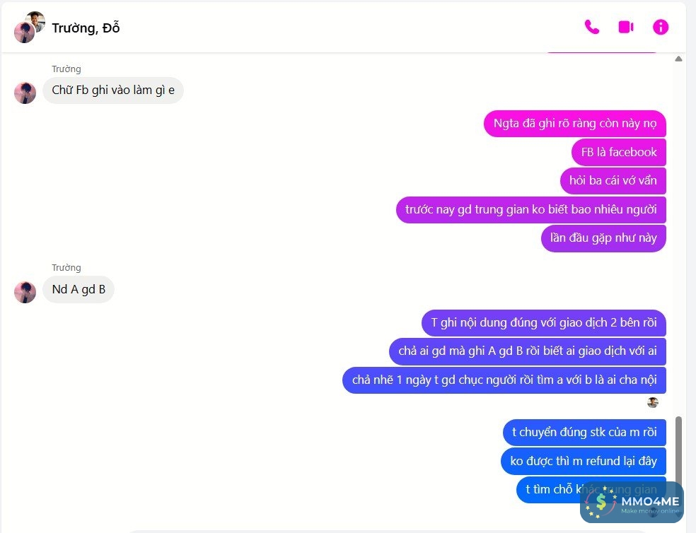 Giao dịch mình chuyển tiền xong thì bên trung gian làm khó bảo nội dung sai, trong khi mình đã ghi rõ ràng nội dung giao dịch giữa 2 bên FB với nhau. Trung gian Nguyễn Trường bắt mình phải chuyển khoản thêm 1 lần nữa mới nhả lại số chuyển khoản ban đầu, mình từ chối thì hắn out group, chặn tất cả liên lạc. Có hình ảnh đính kèm bên dưới.