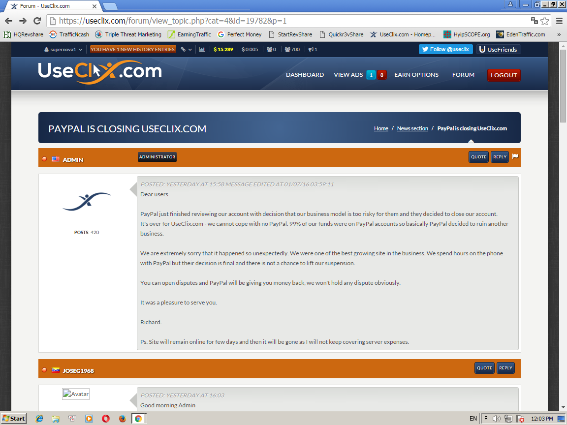 Ở đây thì tiền của UseClix ở trong Paypal , Admin UseClix chả làm được gì cả, chỉ còn cách là admin đóng site để member có thêm lý do dispute.