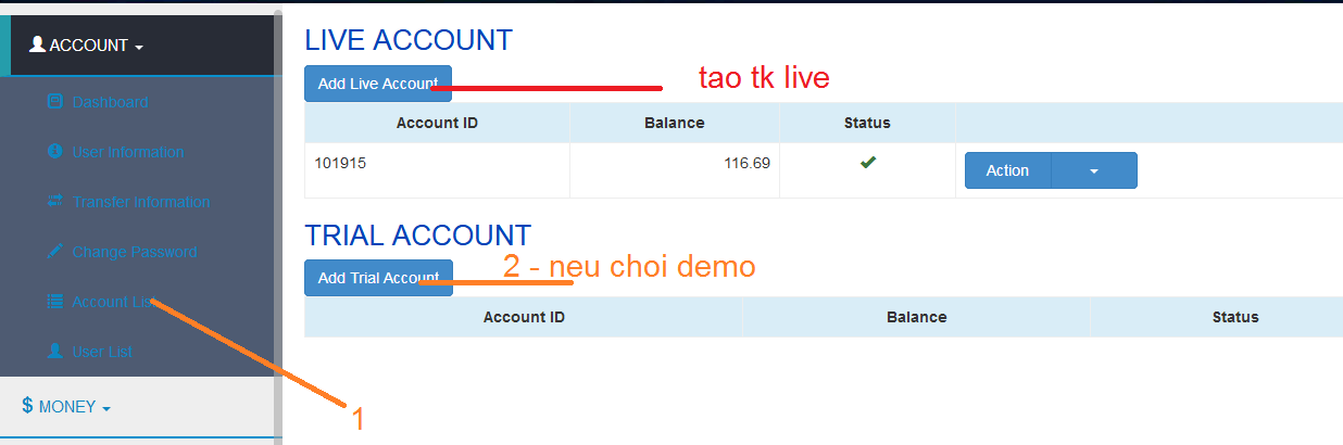 Sau khi tạo tài khoản xong có thể tạo tài khoản demo để trade trước theo các bước sau: