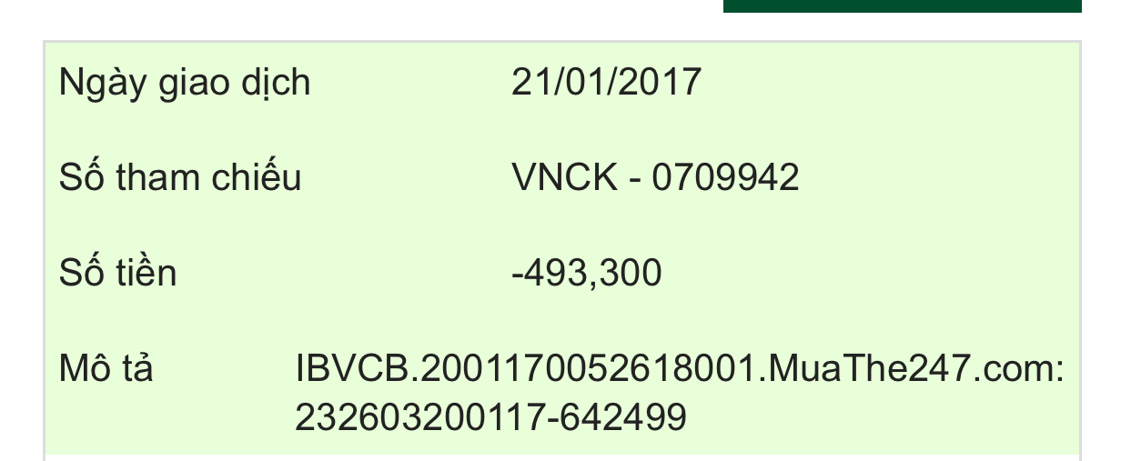 bạn nhận đc chưa, chắc bạn chuyển vào buổi tối lúc VCB ko update sao kê nên hệ thống ko auto đc. VCB càng ngày càng lởm, sau 8h tối sao kê thì ko có, sms thì siêu chậm.Mình mới mua cái thẻ vt 20k,đợi tầm 10p rồi vẫn chưa thấy thông tin thẻ,mình đã chuyển đúng như theo yêu cầu rồi,bạn check lại giúp mình với nhé![]()