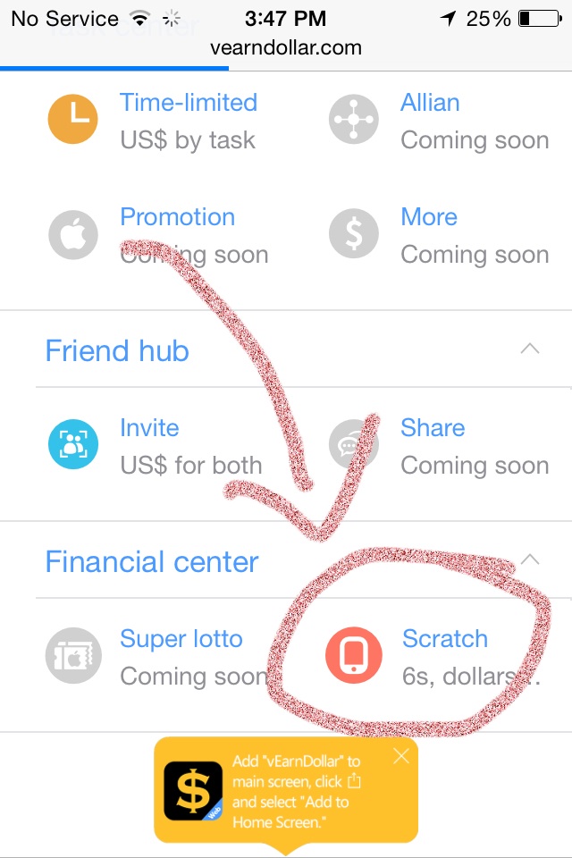 Thêm tính năng mới trong vEarndollar> Scratch ( cào cào) - miễn phí 1 lần cào mỗi ngày với mức trúng thưởng từ $0,1-$1 hoặc phiếu bốc thăm may mắn gồm 9 mảnh iphone6s tập hợp lại để đủ điều kiện bốc thăm. Nếu muốn cào tiếp thì tốn $0,5 ( cào 1 ngày 1 lần là đủ rồi, đừng tham nhé các bạn)