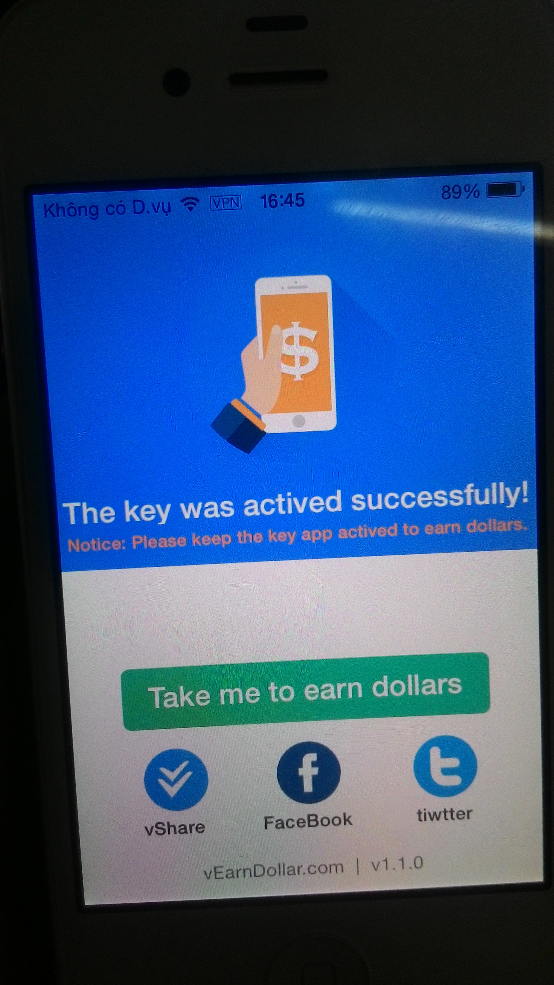 Nó vẫn màu xanh bác ahNó chưa bật key online lên thì bác ko thể tải, bác thoát ra rùi click vào ứng dụng, nếu cái chữ take me to earn dollars nó đang ở trạng thái xám thì bác cài lại key, đôi khi nó bị lỗi