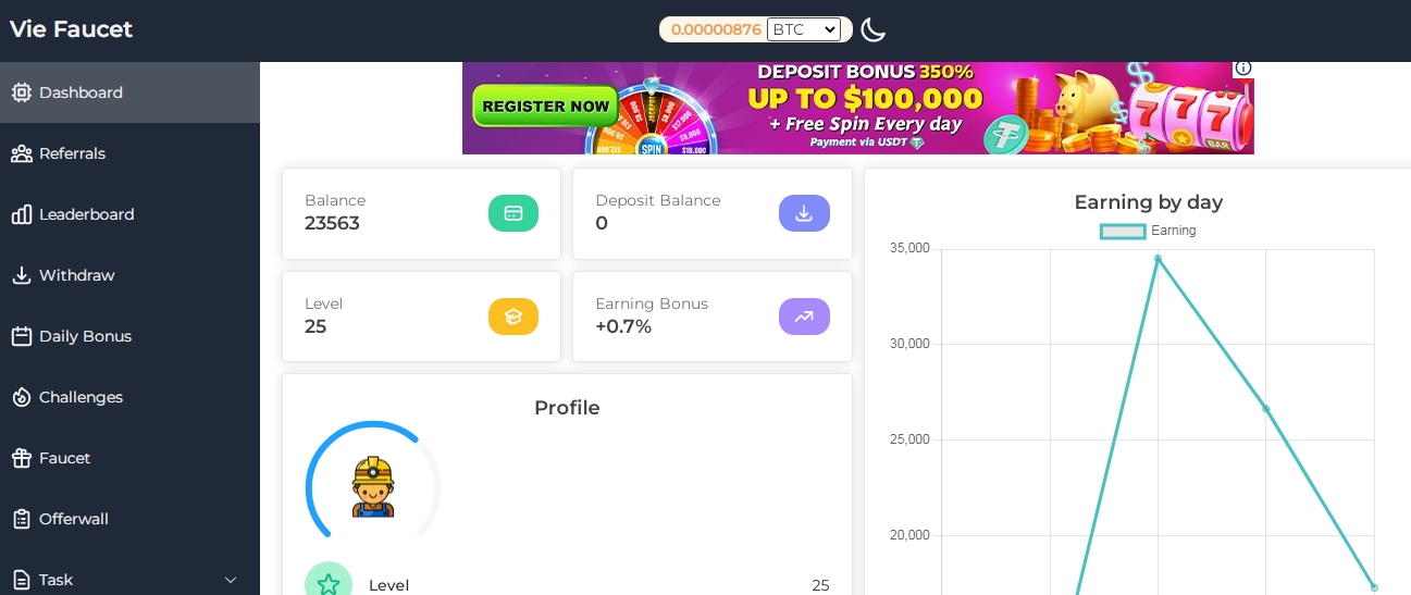 Trong các trang Faucet mình thấy trang này kiếm kha khá từ các tính năng đơn giản như Faucet, Shortlink, PTC, Challenge, Bonus.