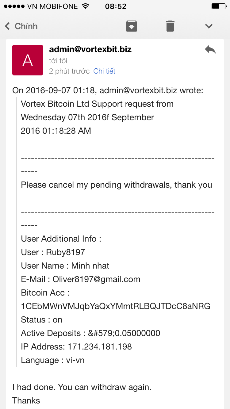 Bình thường e rút cũng lớn, tại muốn test site nên sáng nay vào rút thử lại dính pending. Giờ lệnh đó không cancel được, vừa gửi support đang chờ reply