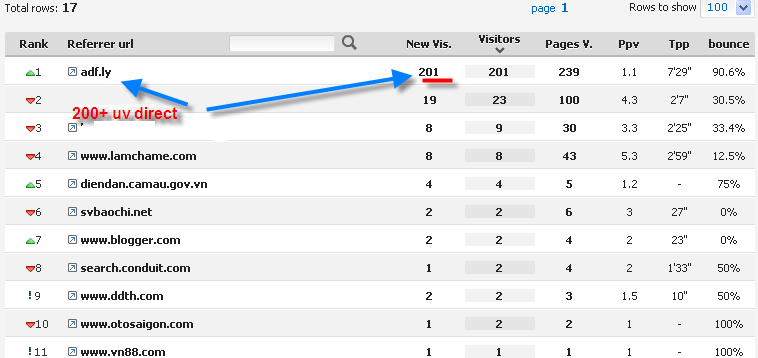Sau mấy ngày đặt thử mình thấy một điều thú vị dù blog của mình là blogspot miễn phí, traffic thường ngày khoảng 500 uv / ngày thế mà sau khi đặt đoạn mã cho website của adf.ly mấy ngày nay traffic tăng vọt gấp đôi, mình xem trong hitstat thì thấy trafic direct chủ yếu từ adf.ly do đó lượt view cũng tăng lên và alexa cũng tăng thêm, một công đôi việc, vừa kiếm thêm $ từ CPM, vừa tăng rank alexa, thật thú vị xin chia sẻ cùng các bạn.