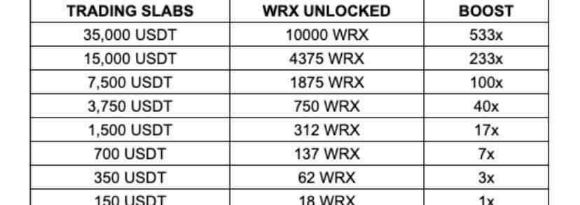 Mọi người tham khảo bảng này để biết cần trade bao nhiêu đô để mở khóa WRX nhé. Quý này còn 15 ngày nữa là kết thúc mở khóa nhé, ae tranh thủ nạp tiền vào trade mà mở khóa. WRX có thể lên 10$ trong năm nay. Mình chưa bán xu nào đâu