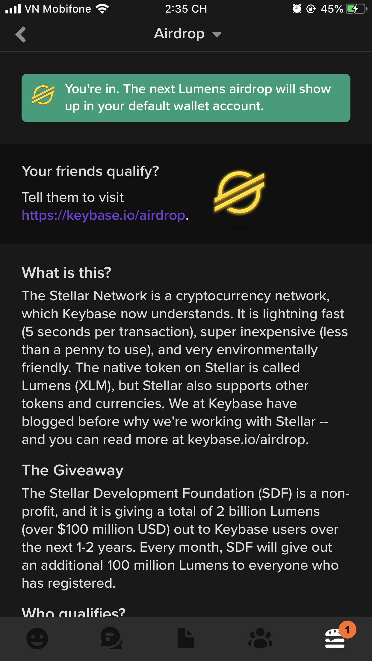 Như một món quà bất ngờ, Stellar Development Foundation gửi 100 triệu Lumens, trị giá 6 triệu USD, cho 300.000 người dùng Keybase vào mỗi 15 hàng tháng (bắt đầu từ 15 tháng 10).
