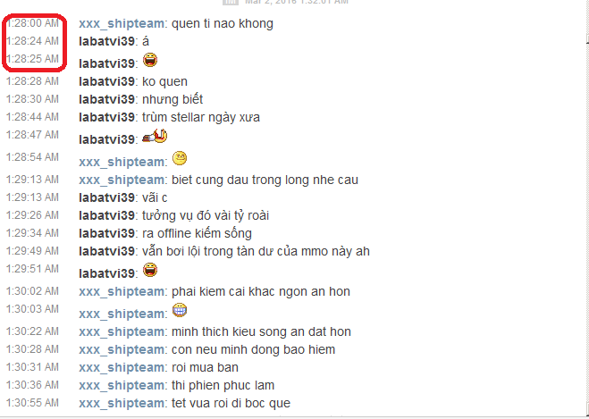 Đêm 01-03-2016, nó pm mình bảo có nguồn MB ko rõ ràng, mong muốn hợp tác. Nc 1 lúc thấy khá hợp, nó lại show cái acc nó là @Tlee88 . Mình nhớ ko lầm thì nó là thằng trùm đưa stellar về mmo4me, nghĩ vụ đó nó ăn đủ nên chắc ko có vấn đề gì.