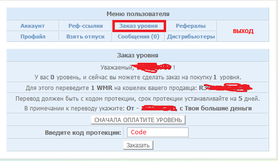 đầu tiên ấn vào Заказ уровня ( ở phía trên cùng ý ) lưu lại số wmr của người bán sau đó các bạn điền code ( code này do các bạn tự nghĩ ra, để người bán xác nhận) cuối cùng là ấn vào Заказать. Xong. Đến bước này thì các bạn đợi, đợi đến khi được xác nhận đã bán thì các bạn đã ở mức 1. Sau đó các bạn vào wmr của mình, chuyển tới số wmr của người bán ( số này ở trên các bạn thấy), lưu ý chuyển tiền với mã bảo vệ, và điền mã bảo vệ như code ở trên. Lưu ý: trong tài khoản WMR của các bạn phải có ít nhất 1 rub. NHƯ SAU: