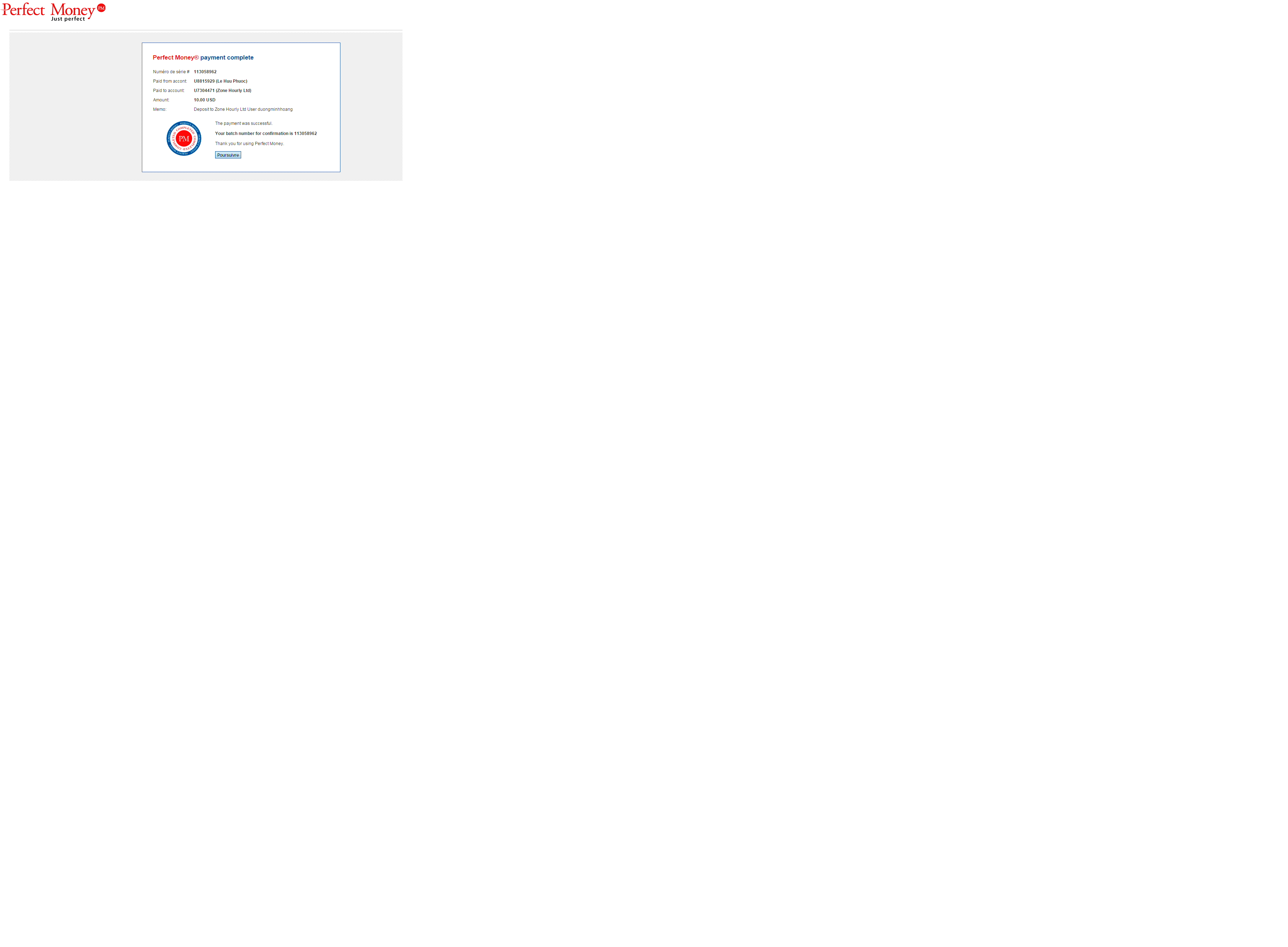 The amount of 0.6 USD has been deposited to your Perfect Money account. Accounts: U7304471->xx. Memo: API Payment. Withdraw to bangbang from Zone Hourly Ltd.. Date: 12:26 11.12.15. Batch: 113051282.